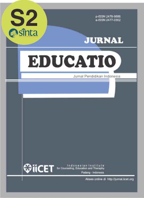 Jurnal EDUCATIO: Jurnal Pendidikan Indonesia ISSN: Print 2476-9886 –Online 2477-0302 is a peer-reviewed, scientific journal published by Indonesian Institute for Counseling, Education and Therapy. The aim of this journal is to publish articles r